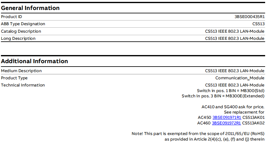 CS513 adalah komponen komunikasi jaringan utama dalam sistem kontrol proses terdistribusi ABB Advant Master. 3BSE000435R1 didefinisikan sebagai Modul LAN IEEE 802.3. Fungsi intinya adalah menyediakan antarmuka komunikasi Ethernet standar untuk pengontrol seri Advant Controller 410/450, memungkinkan mereka mengakses jaringan area lokal tingkat pabrik berdasarkan protokol IEEE 802.3.