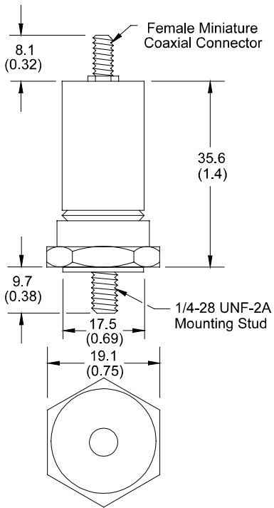Gambar ini memberikan dimensi terperinci (dalam milimeter/inci) dari 23732-01 accelerometer, termasuk pemasangan benang dan tinggi, dan merupakan referensi utama untuk pemasangan.