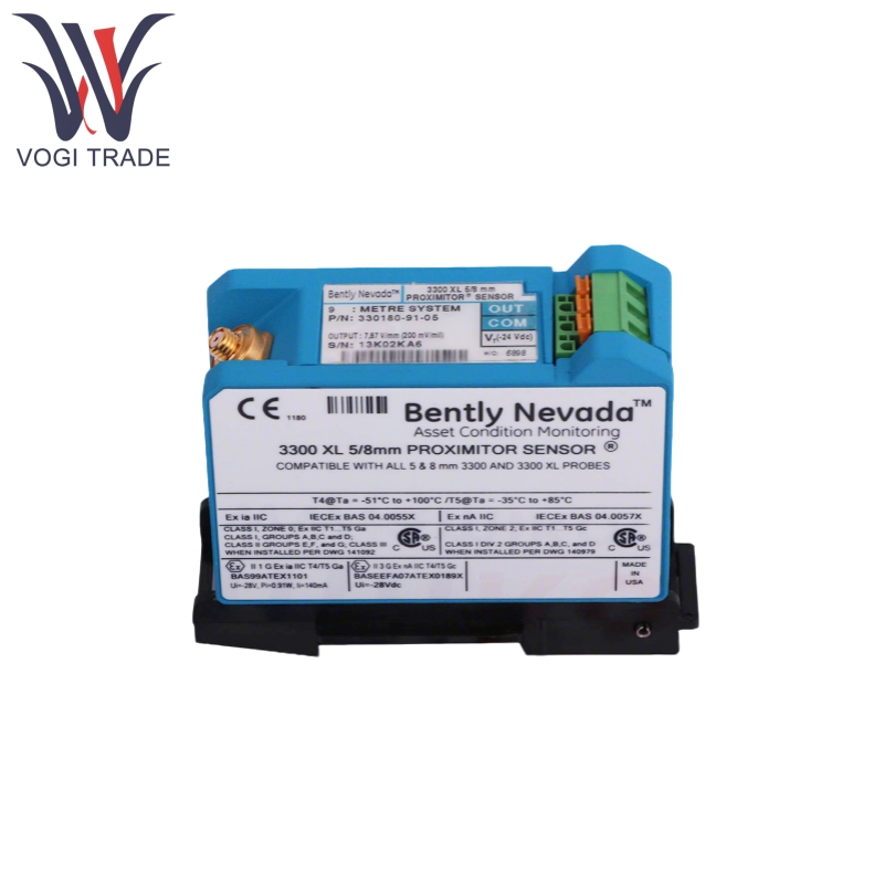 Benty Nevada 330180-51-00 Sensor kedekatan memungkinkan pemantauan getaran radial, dengan probe ganda yang dipasang secara ortogonal (mis. Perumahan bantalan turbin).