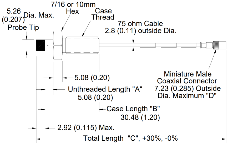 Panjang kabel ekstensi (4,0 m) harus ditambahkan ke panjang probe untuk sama dengan total panjang sistem yang ditunjukkan pada sensor pemancar (mis., 5 m atau 7 m).