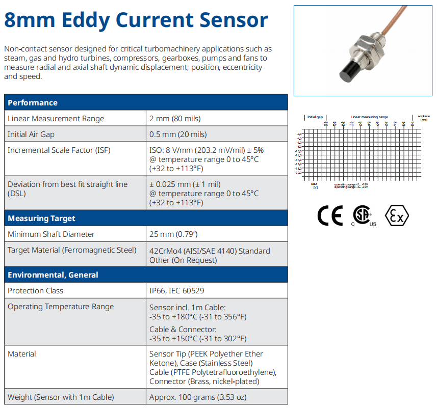 PR6423/013-130 dapat menangkap getaran radial atau aksial tingkat mikrometer pada poros secara real-time, dengan rentang respons frekuensi biasanya berkisar antara 0 hingga 10 kHz, yang cukup untuk mencakup frekuensi karakteristik sebagian besar kesalahan mesin yang berputar. Posisi Statis