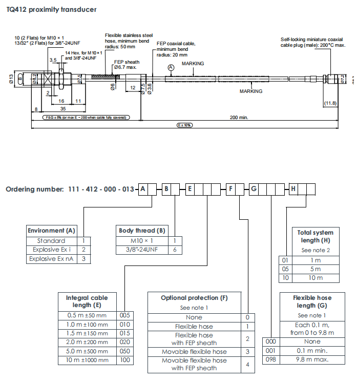 M10x1, kabel terintegrasi 1m + kabel ekstensi 9m, selang baja tahan karat + selubung FEP (1m) |