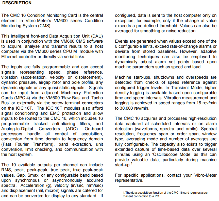 Merk : Vibro-MeterDeskripsi : Kartu Pemantau KondisiKondisi: BaruSertifikat: SURAT GARANSI LAPORAN UJI COOGaransi: 1 tahunJumlah Persediaan: 5Jangka Waktu Pembayaran: T/TPelabuhan Pengiriman: XiamenVibro-Meter CMC16 adalah unit akuisisi data front-end cerdas dan berkinerja tinggi yang dirancang oleh perusahaan Swiss Vibro-Meter untuk sistem pemantauan kondisi (CMS) seri VM600 andalannya. Dalam model 200-530-012-012, 012 mewakili versi perangkat lunak tertanamnya, dan 012 mewakili versi perangkat kerasnya.